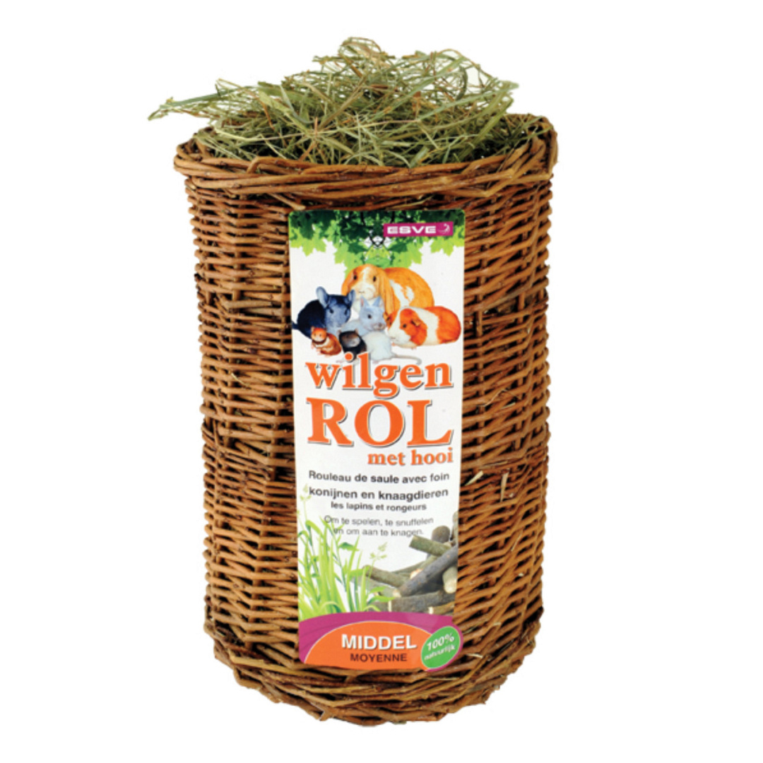 De rol is gemaakt van wilgenhout en gevuld met smakelijk hooi. Met de wilgenrol kan jouw huisdier knagen, snuffelen, knabbelen en spelen.